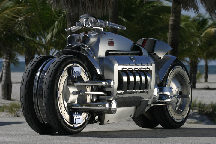 Der 507 PS starke Viper V-10 Motor mit Hinterradantrieb ermöglicht eine theoretische Höchstgeschwindigkeit von 676 Kilometern pro Stunde - für jeden der das herausfinden möchte. Der Dodge Tomahawk röhrte während der North American International Auto Show 2003 in Detroit an die Öffentlichkeit.